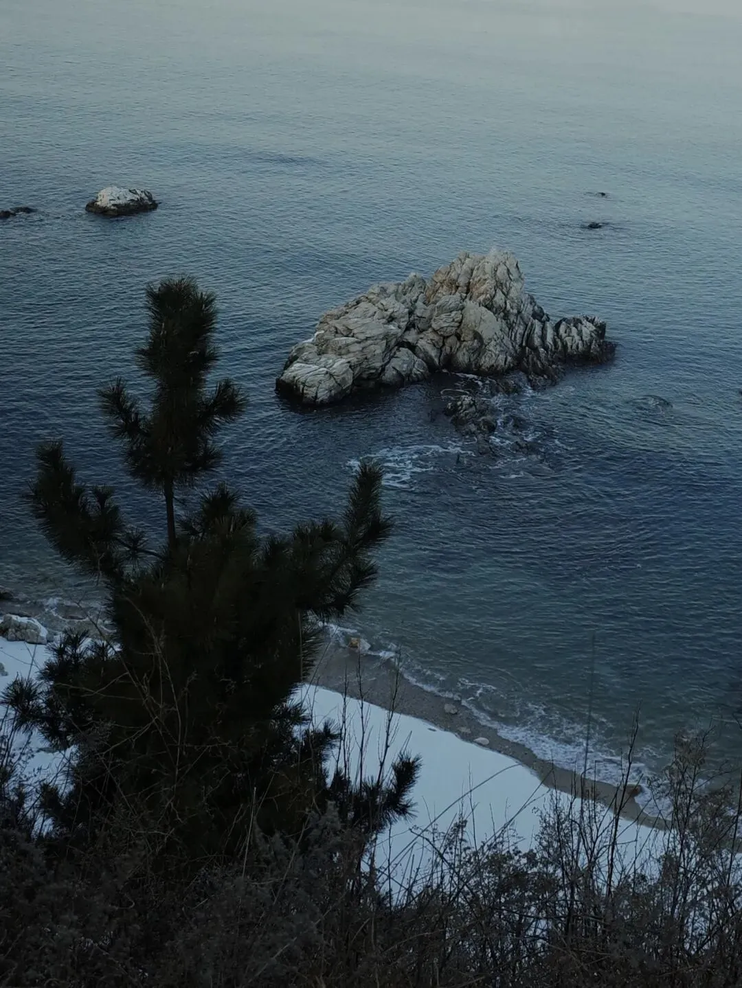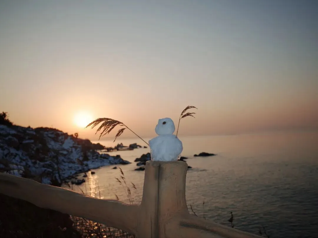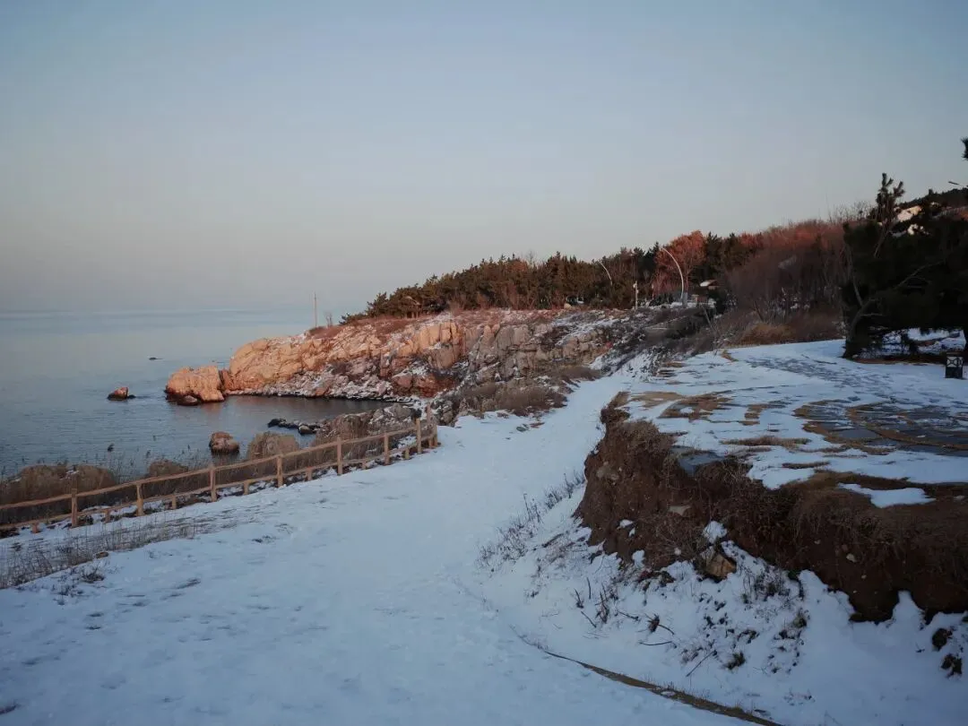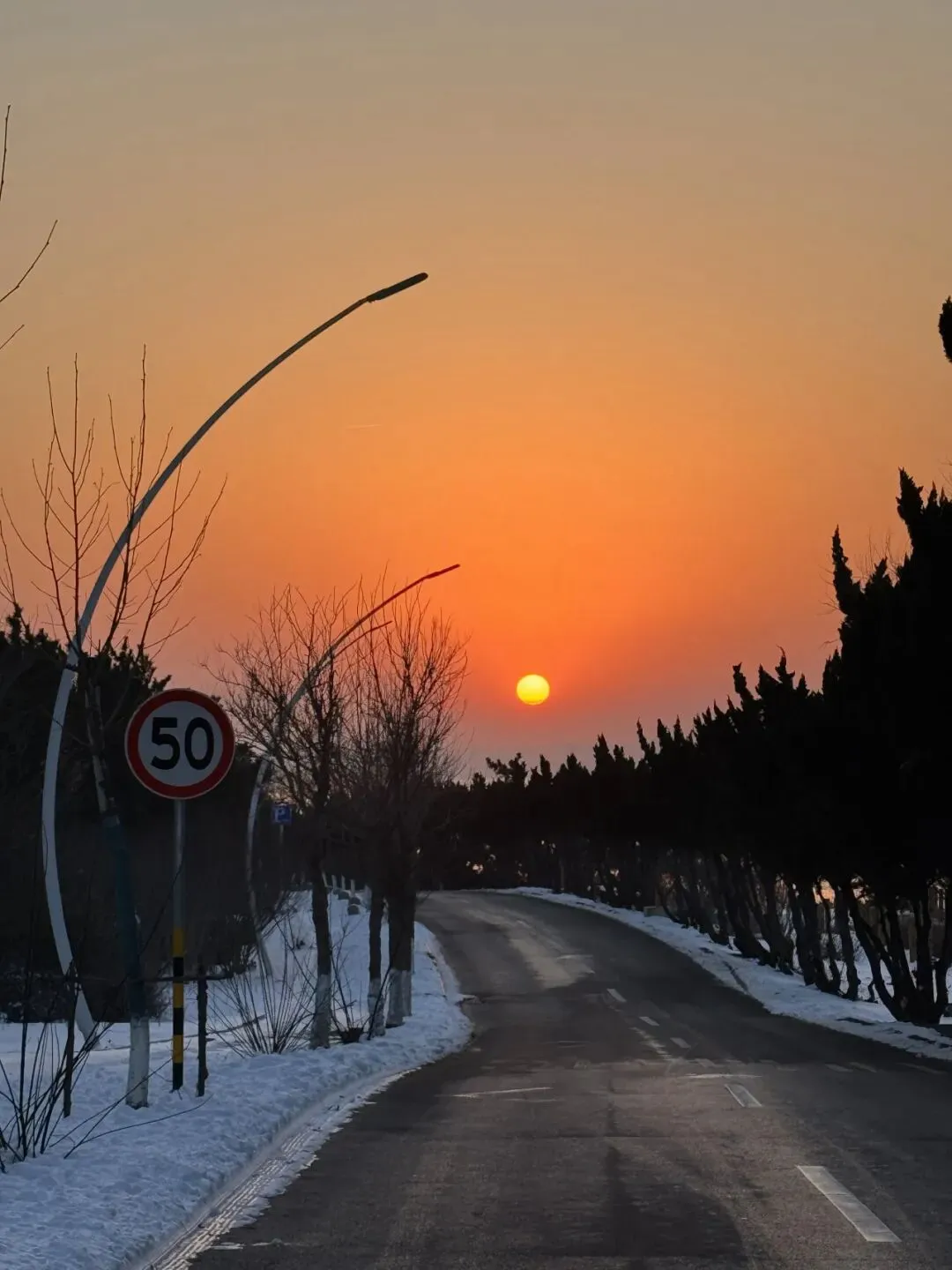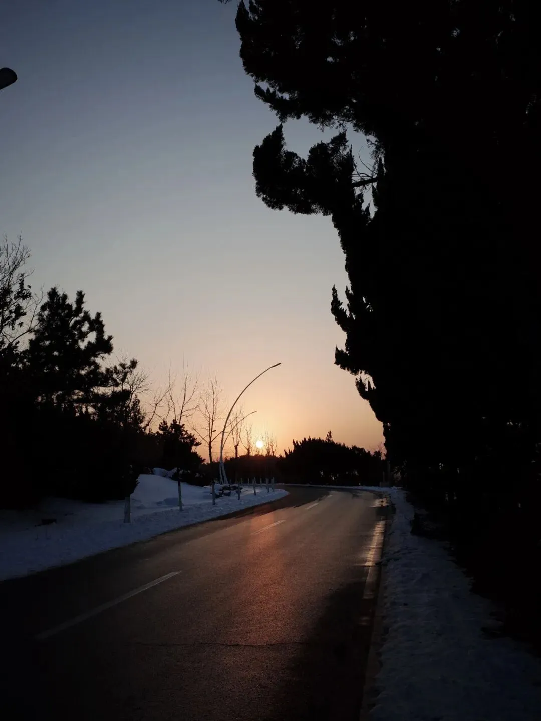 岛上日落只是一瞬间的事,当我在养马岛一处海滩看到太阳燃烧起来变成了热烈的橙色,知道白日将尽,此刻我想尽快赶往一个叫莲花夕照的点位去看日落,但在途中又被公路上的景致迷得走不动:青黑色的公路在雪地里延伸,夕光温柔地倾泻下来,路边松树迎着风的触角披上金色头纱。就这样,我把车停了下来静静看着。就这样,刚下午五点半,路灯亮起,黑夜突然就降临了,大海陷入黑暗中。