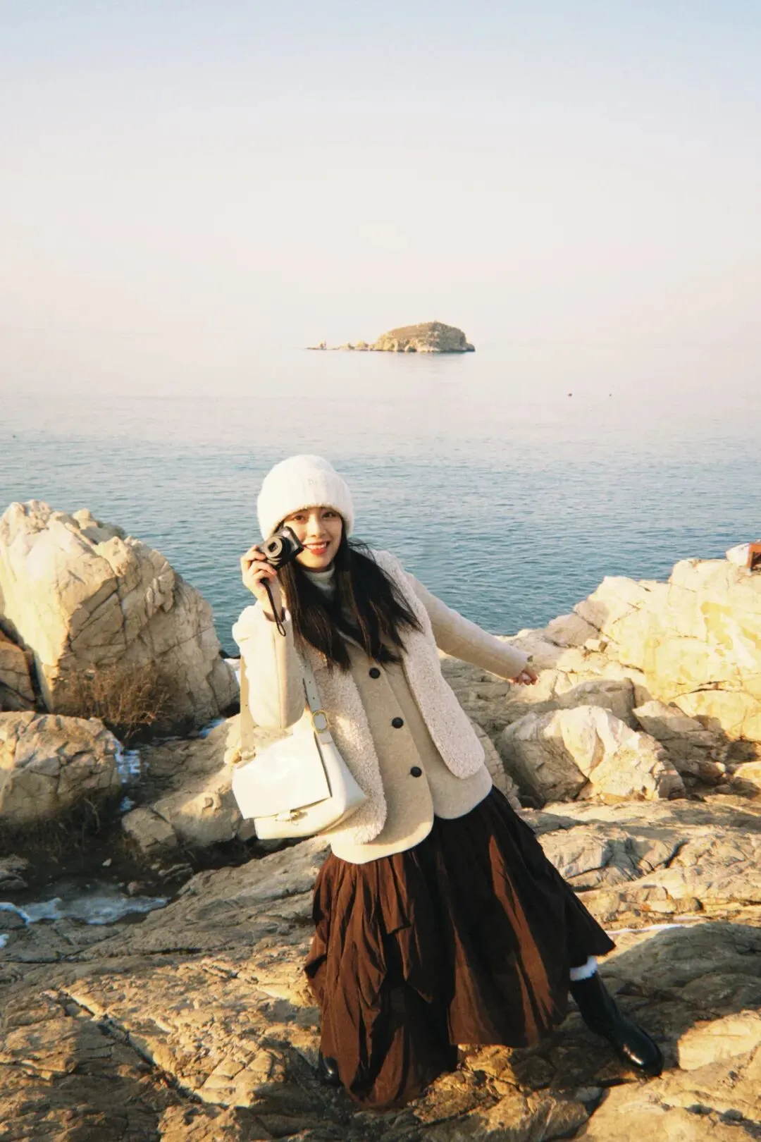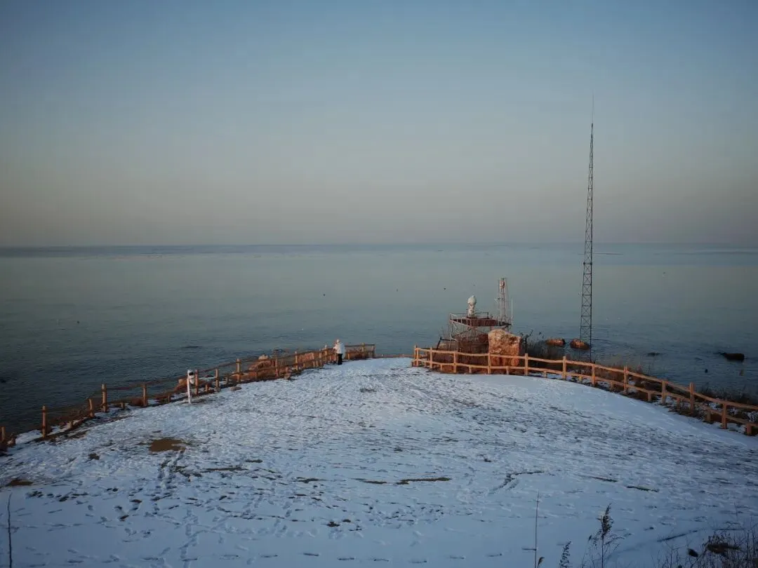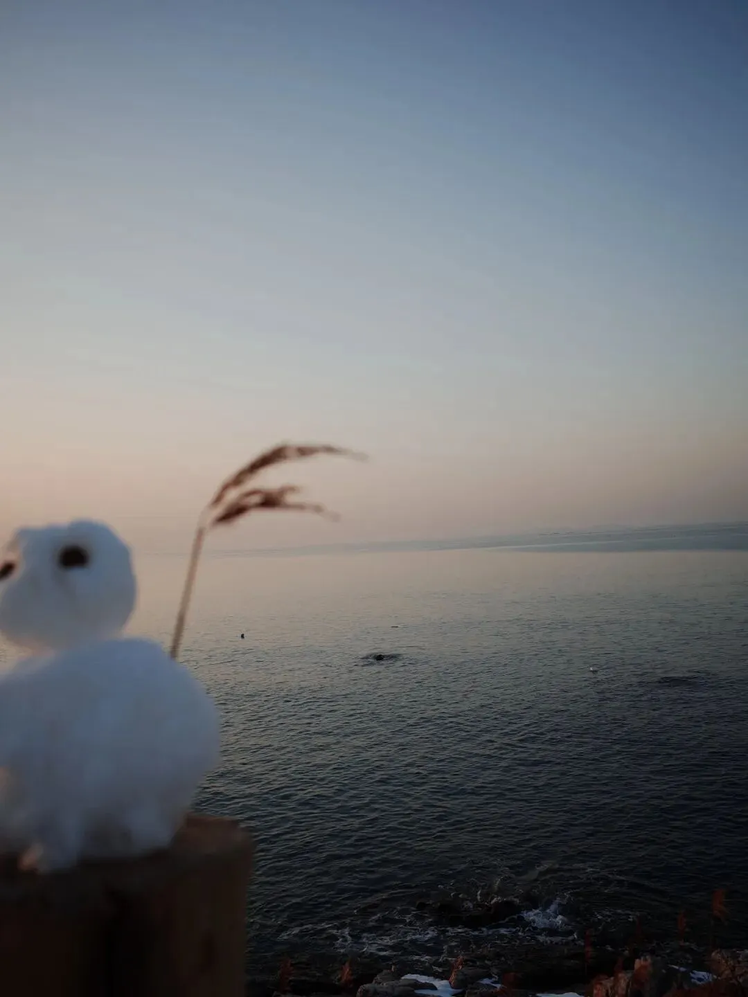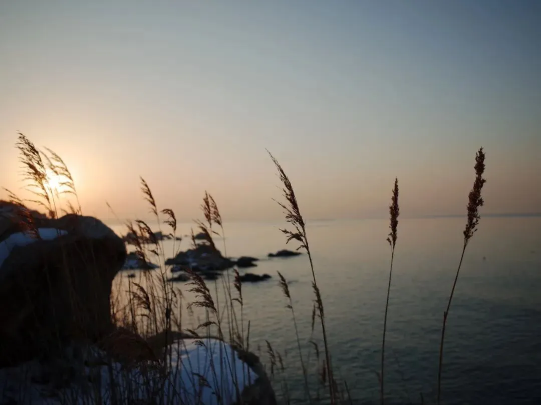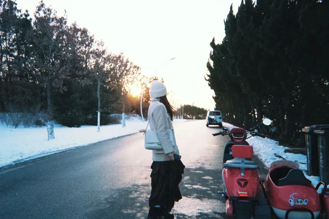 岛上日落只是一瞬间的事,当我在养马岛一处海滩看到太阳燃烧起来变成了热烈的橙色,知道白日将尽,此刻我想尽快赶往一个叫莲花夕照的点位去看日落,但在途中又被公路上的景致迷得走不动:青黑色的公路在雪地里延伸,夕光温柔地倾泻下来,路边松树迎着风的触角披上金色头纱。就这样,我把车停了下来静静看着。就这样,刚下午五点半,路灯亮起,黑夜突然就降临了,大海陷入黑暗中。