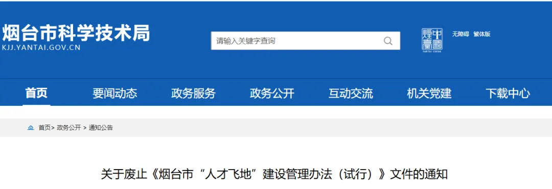 根据上级有关要求,经研究,决定废止《烟台市“人才飞地”建设管理办法(试行)》(烟科〔2025〕11 号)文件,上述文件自本通知印发之日起停止执行。