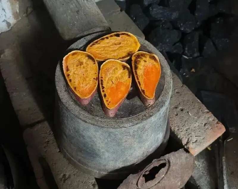 家里也有火炉子取暖。炉子盖上放一点地瓜片。烤熟的地瓜片颜色焦黄、还会流出焦糖色的地瓜油。