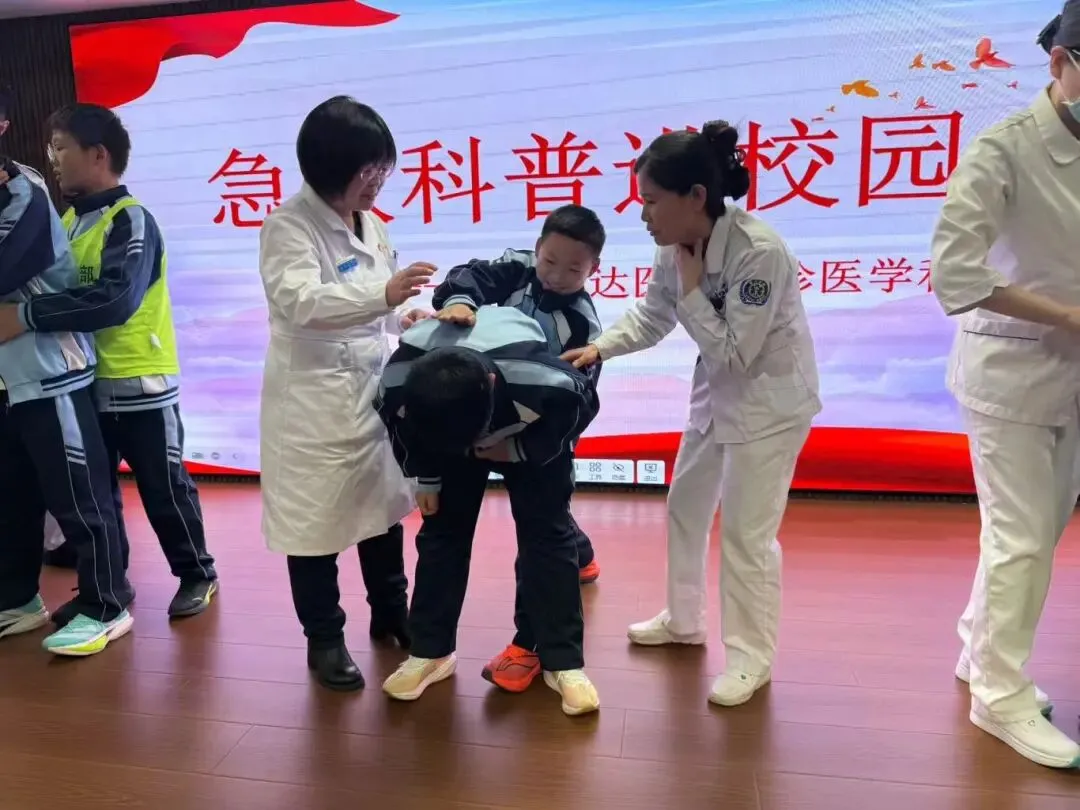 活动中,救护师资专家系统讲解了心肺复苏(CPR)的核心操作流程,细致涵盖了从意识判断、紧急呼救,到胸外按压位置深度、频率以及人工呼吸要领等关键环节。针对日常生活中常见的气道异物梗阻风险,专家重点演示了海姆立克急救法的标准操作,并清晰指明了成人与儿童在手法上的重要差异,使学生们对急救知识的适用性有了更准确的认识。