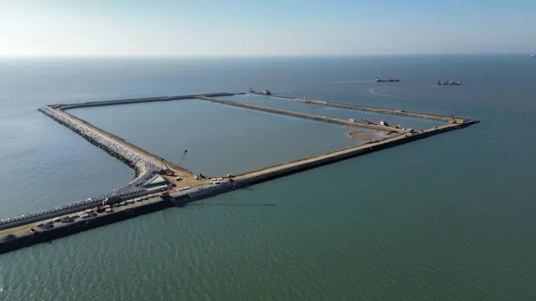 随着32个巨型沉箱全部精准就位