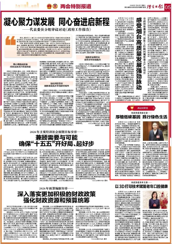 烟台,一面是层峦叠翠的生态脊梁,一面是碧波万顷的蓝色大海,山海相依的独特禀赋,既孕育了“仙境海岸”的生态之美,更被赋予了践行绿色低碳发展的天然使命。为此,市政协委员、山东国和堂制药有限公司董事长赵言奎建议,大力倡导绿色低碳生活方式,让每一位市民都成为低碳城市建设的参与者、受益者、推动者,共同谱写“人在画中居、城在绿中长”的烟台新图景。