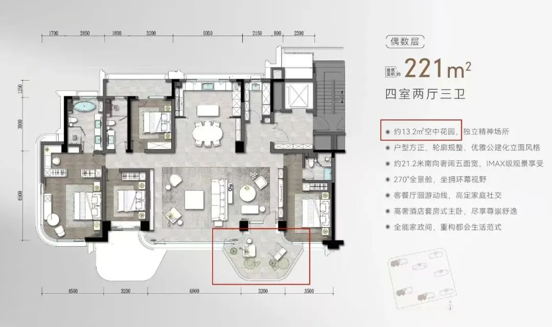 君一雲启整个小区7栋楼,只有不靠路的4栋楼,做了四代宅设计。主力户型221㎡的大平层,其空中花园面积竟然只有13.2㎡。