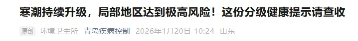 20日,崂山区低温健康风险等级为高风险,其余区市为较高风险。