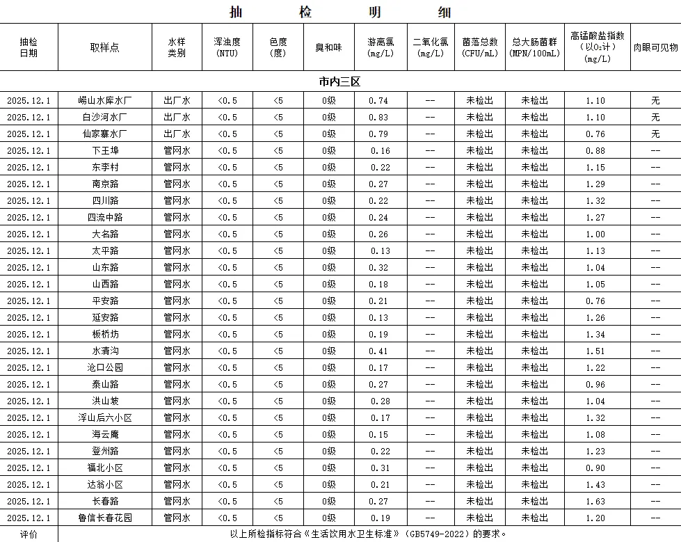 水质检测依据二次供水设施的类型来确定,主管部门和供水企业一直严格按照国家及省市相关标准进行水质检测工作,请放心饮用。