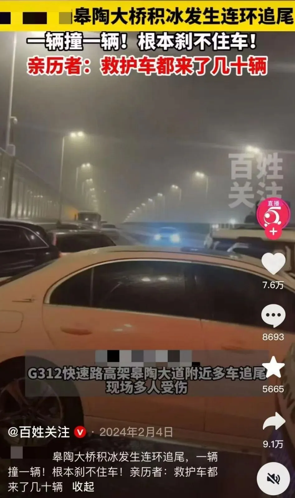 1月19日,有网民在微博平台发帖称“青岛大雪后道路结冰湿滑,早上去上班上学的车辆在胶宁高架乱成一锅粥”;还有网民在抖音平台发布视频称“青岛下雪路滑,昨晚走的重庆路高架桥,刹车ABS都不好用”,所配视频相同,皆为多车连环追尾事故画面。