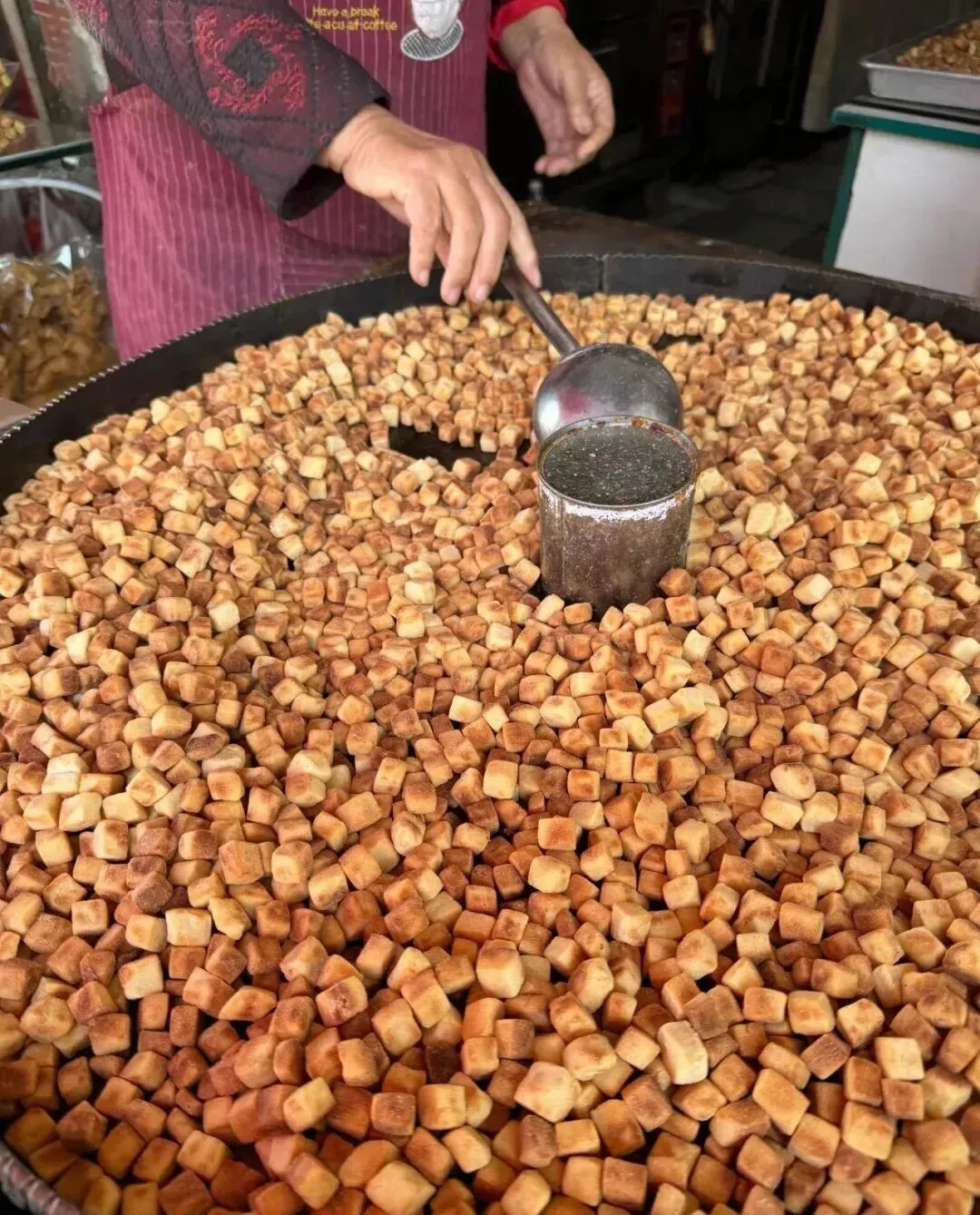 外面酥酥的 , 里面有点绵软 , 甜度刚刚好 , 不会齁嗓子。 关键是越嚼越香 , 我一个人站在店门口 , 不知不觉就吃了小半袋。