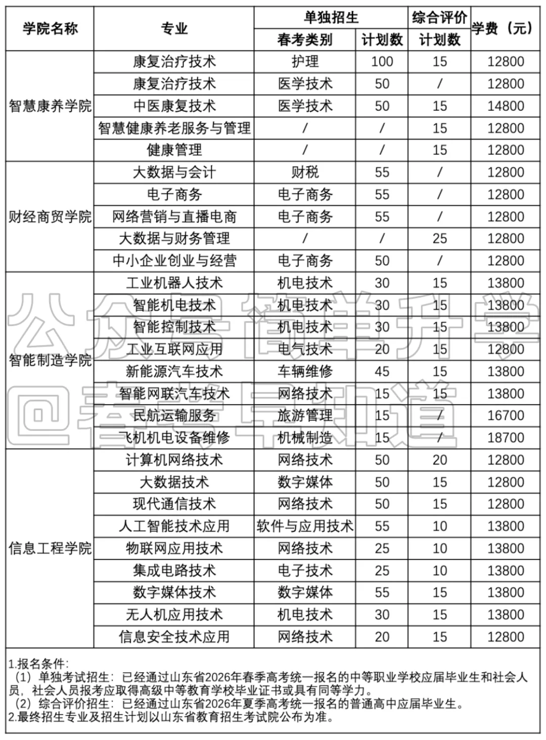 >烟台城市科技职业学院2026年单独招生、综合评价招生计划