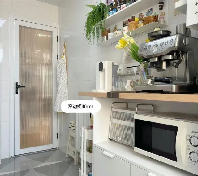 蔬菜、杂物、厨房零散的小玩意儿,全都能塞进去,关键是宽度只有30厘米,完全不影响过道动线,这种细节设计真的是太聪明了,既增加了收纳空间,又不会让厨房显得拥挤,这就是会生活的人才能想出来的办法啊!