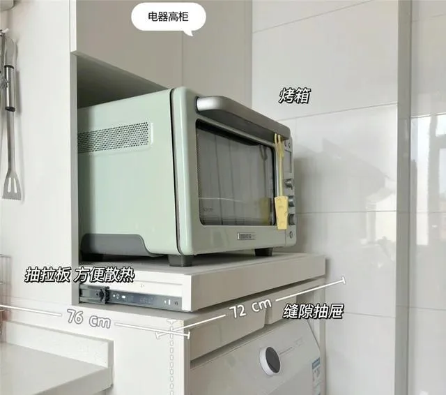 再看看她家的电器柜,洗衣机嵌入底部,上面做抽屉柜和抽拉板,这个设计我真的要给满分!洗衣液、凝珠这些清洁用品有地方放了,烤箱也找到了合适的位置,一点空间都没浪费。