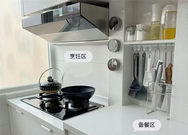 最后说说她家的烹饪区,做在靠窗位置,采光通风都特别好,做饭的时候能看到外面的风景,心情都跟着好起来了!台面的凹槽空间用来收纳锅铲和调味瓶,这种细节收纳真的是太贴心了。