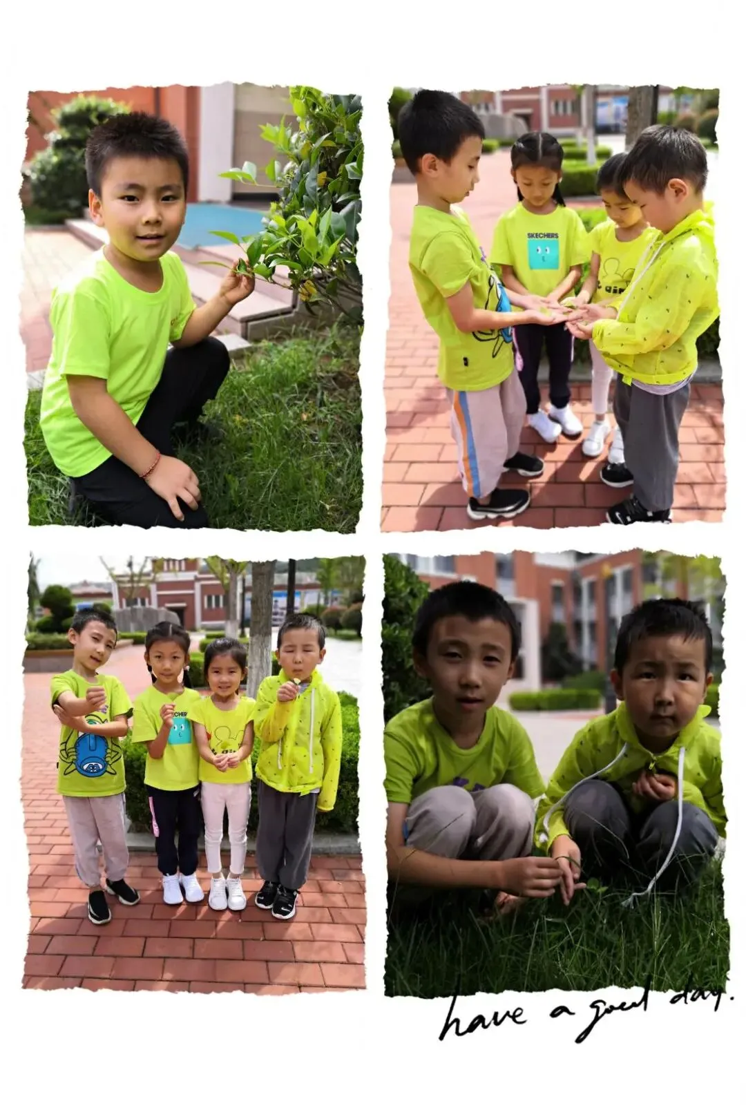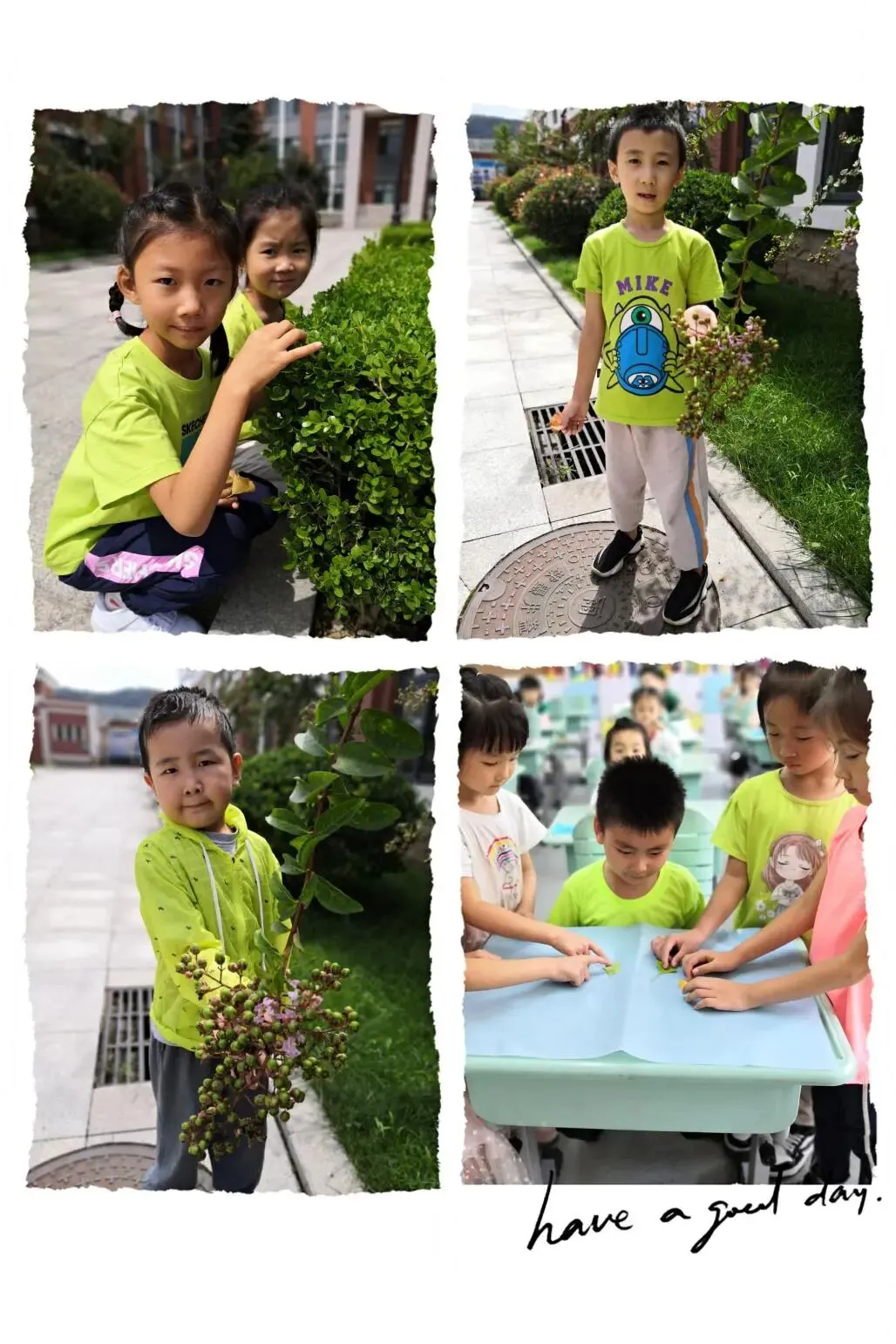 绿色代表着希望,绿色代表着生机。这雨中的绿色,在画家的调色板上是很难调出来的,然而只要见过这水淋淋的绿,便很难忘却。四时俱可喜,最好新秋时。老师们利用中午的时间,带着这群可爱的孩子们开启了一场寻找绿色之旅。