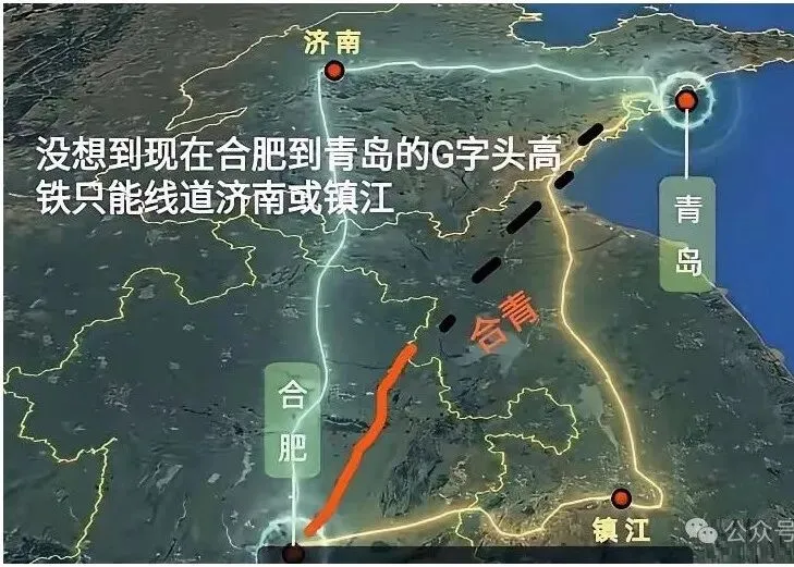合肥到青岛现在只有两条主要的G字头高铁线路,要么往东去镇江,再折回来往北去青岛,要么直接往北去济南,再从济南往东去青岛,两种方式都要绕路,多花钱。
