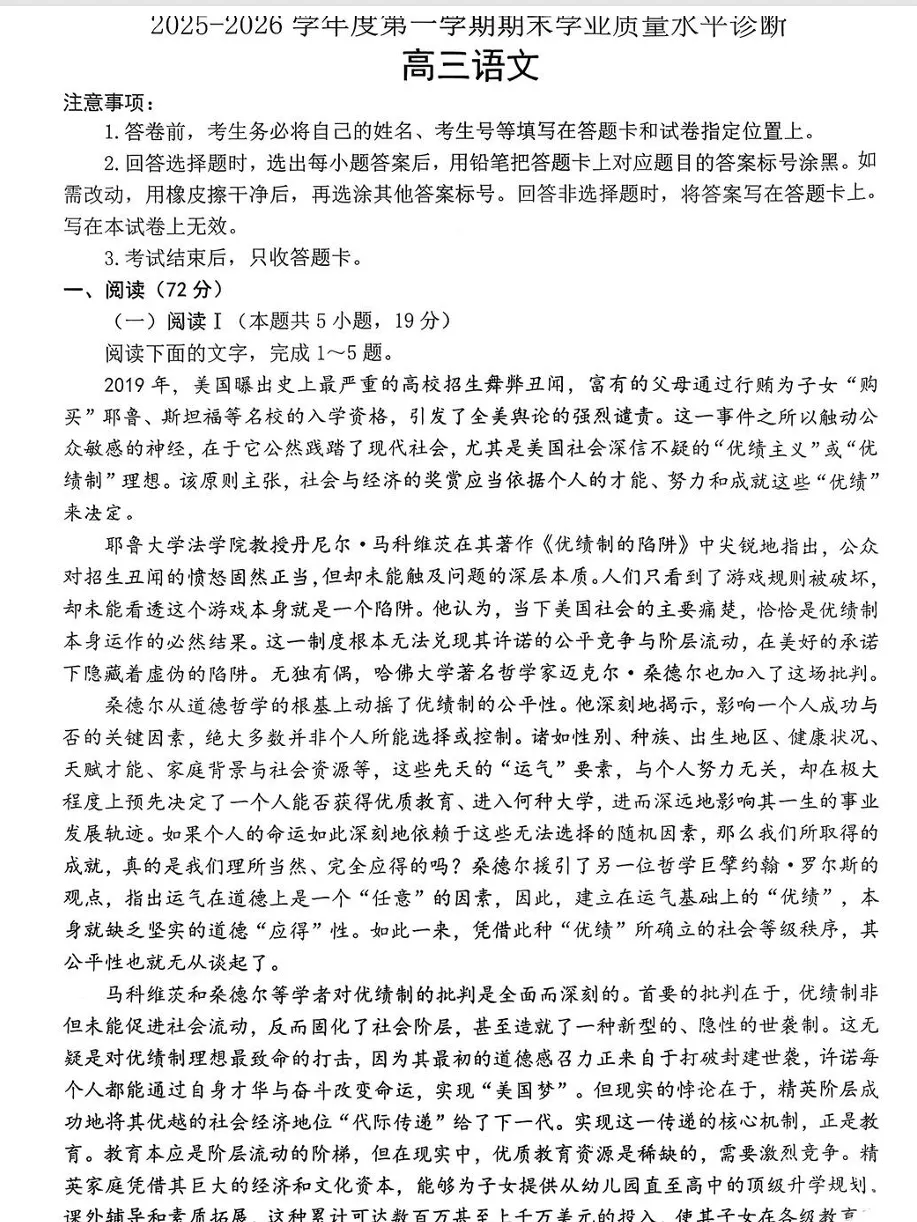 试卷和答案都是考试结束之后发布的,用来给读者的学习提供参考。===============分割线================山东烟台市2025-2026学年第一学期期末学业质量水平诊断(1月20开考),试卷和答案下载,
