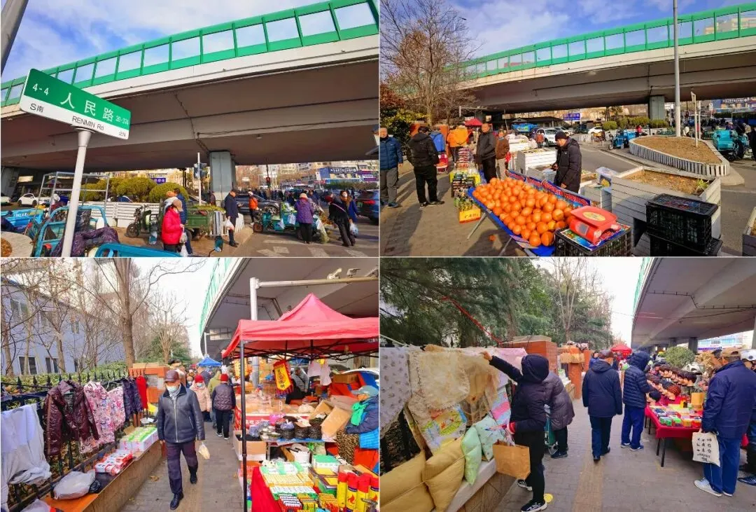 人民路鞍山路沿街摊位比较有特色海慈医院一侧沿街摊位多为农民自产新鲜蔬菜粮食及土特产鞍山路西桥底北侧多为海鲜水果等摊位