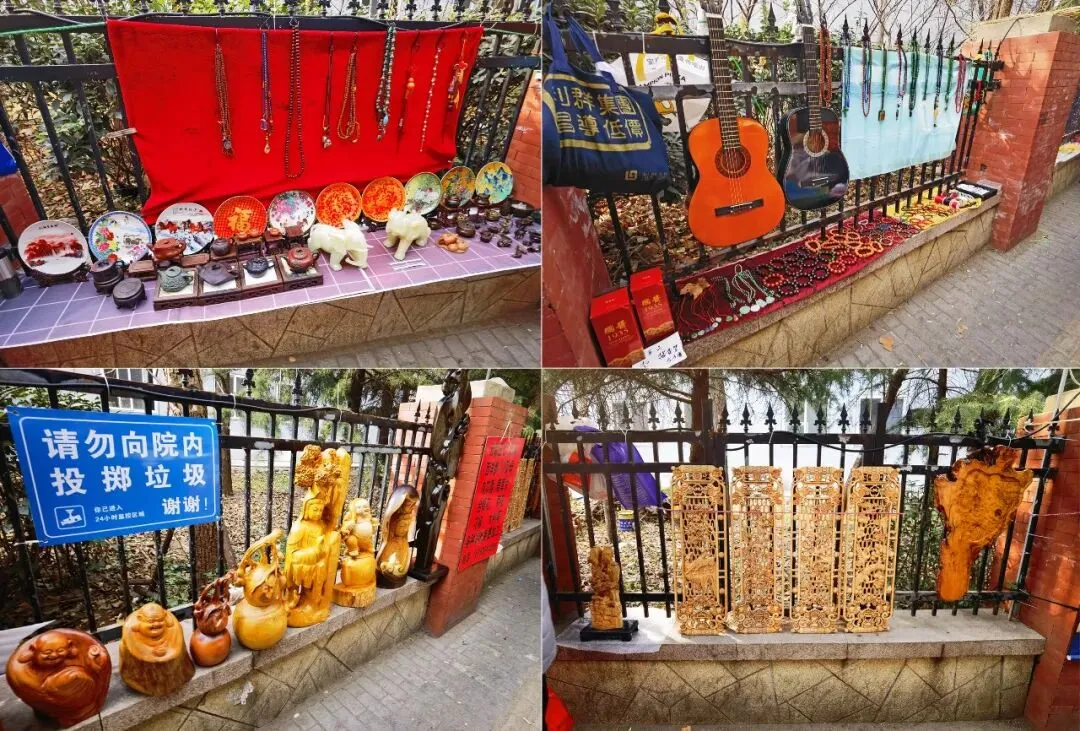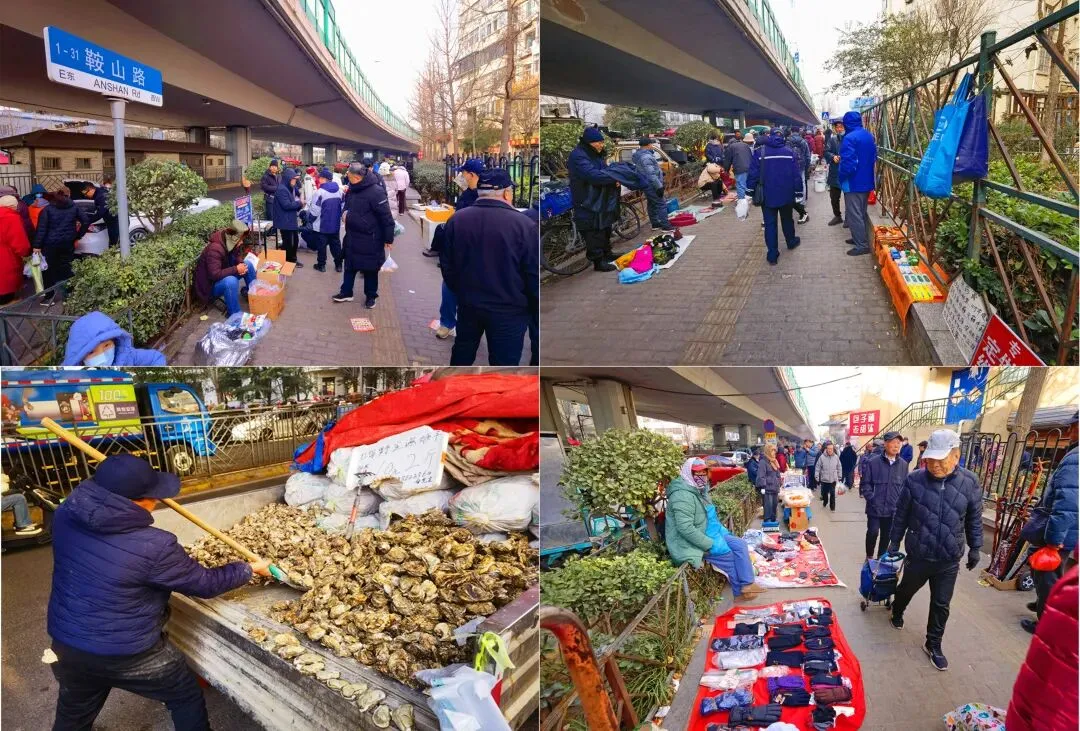 按本次路线,首先走近的是鞍山路与人民路交汇处路边摊位。 这里的边摊位沿路有序排布,以摆摊的自产农产品、土特杂货、古玩及应季海鲜为主。各类商品沿街码放整齐,此处还有售卖杂货针头线脑,花鸟鱼虫,人山人海逛在其中有种身临大集的感觉。