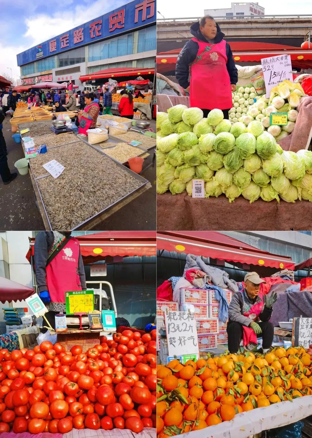 步入康定路农贸市场大院,人潮涌动,各家货车打开后斗变成摊位,老板站在上面大声招揽客户。康定路市场室外摊位以特色农产品为核心。这里多是近郊农户清晨采摘或自家种植的冬季蔬菜,大棚里的草莓、西红柿、黄瓜,还有苹果、红薯、芋头、南瓜等。不少市民专程在此批量采购,为家里的冬储果蔬做补充。水果摊前,多是苹果、梨、橙子,还有成箱的柑橘堆成小山,商贩看见顾客靠前,就会详细介绍并随手拿起果品递给顾客品尝。