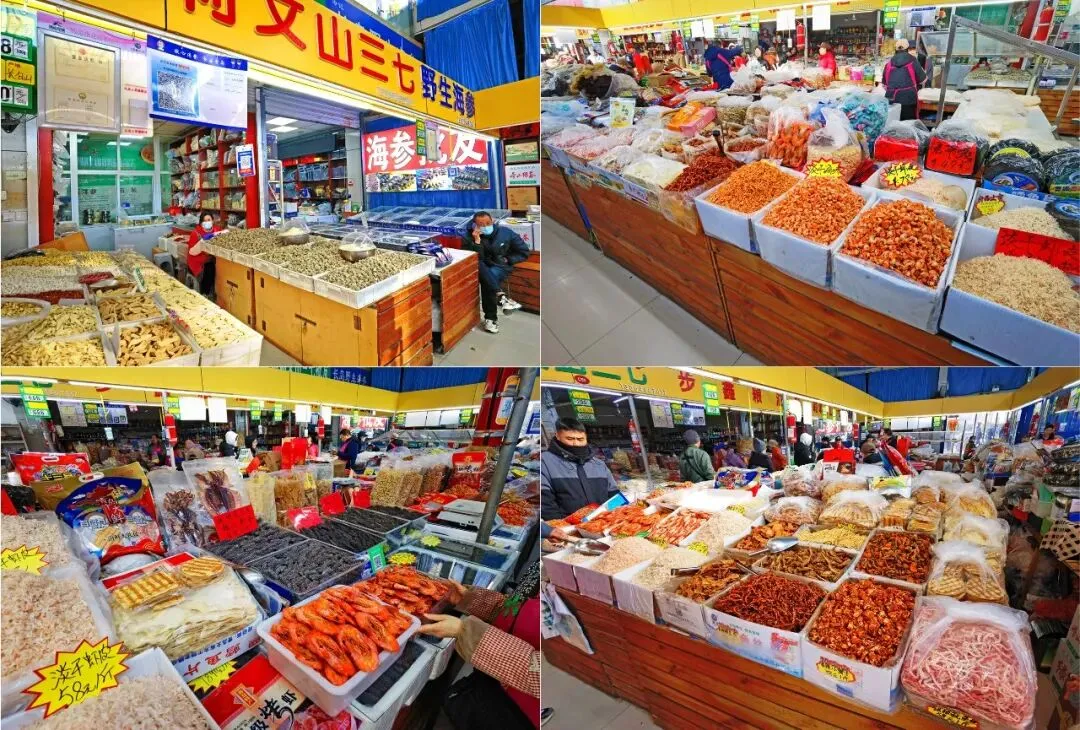 转入室内区域,摊位分区清晰 让人一目了然。干货区里,干海参、虾米、鱿鱼丝、鳗鱼丝等干海产品整齐码在玻璃罐中,各式菌菇如香菇、木耳、银耳、茶树菇干货堆叠成山,还有花椒、八角等香料按斤售卖,不少游客慕名在此挑选伴手礼。干鲜货区,袋装的海带丝、紫菜、裙带菜种类丰富,泡发好的海蜇皮、海蜇头新鲜透亮,摊主不停翻动着晾晒的鱼干鱼片,咸香气息弥漫开来。