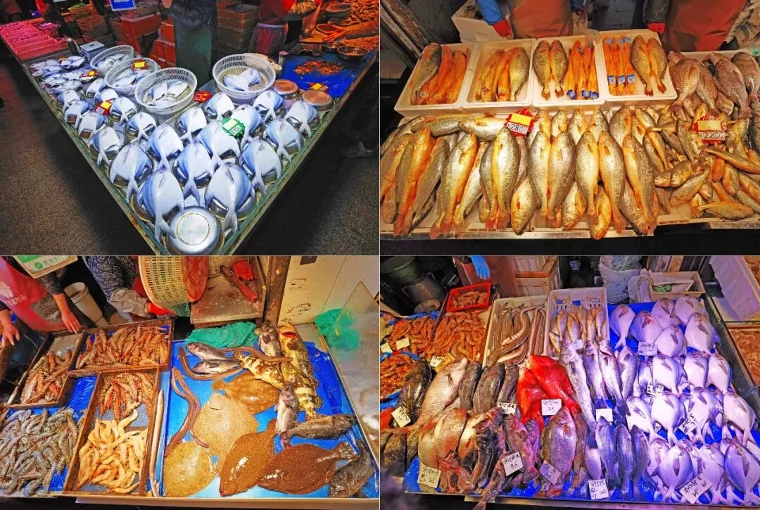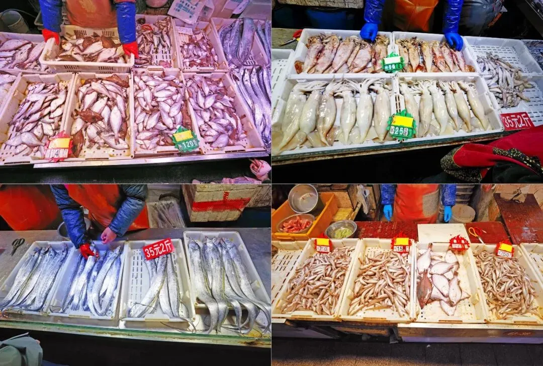 干货区继续往里走就是海鲜水产厅,这可是早市的重头戏,摊位连成片一眼望不到头,堪称小型海洋世界。冬季的海鲜摊位上,常见的是肥美的带鱼、鲳鱼、黄花鱼等海鱼,还有大量的扇贝、海蛎子、蛤蜊、蛏子等贝类小海鲜,泡沫箱里的虾虎、对虾活力满满,八带的触手还在挥舞蠕动。所有海鲜均明码标价,大部分是清晨从码头直运而来,摊主还会耐心讲解挑选技巧与烹饪方法,市场贴心的为外地客人提供泡沫箱打包服务。