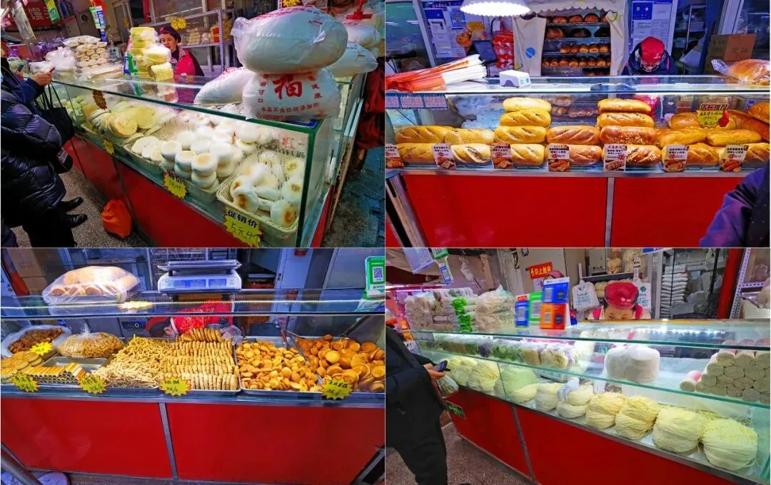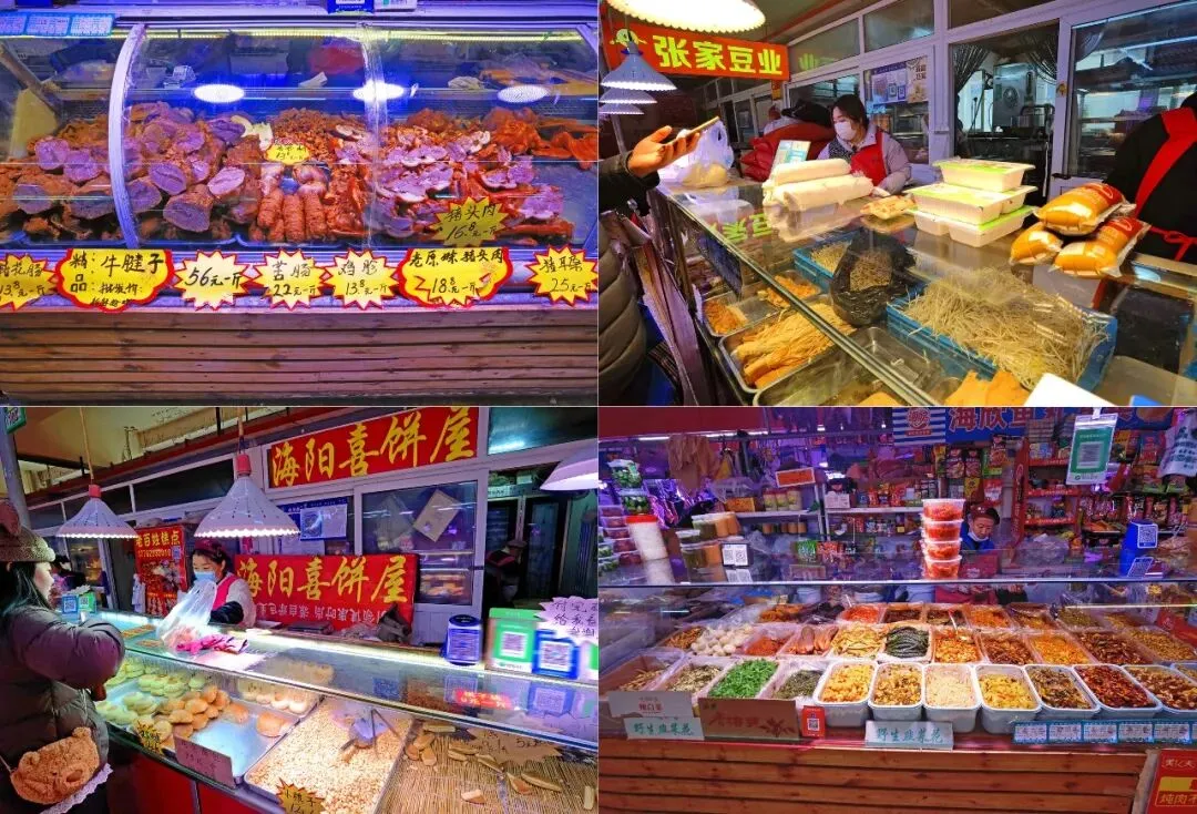 海鲜区的西面就是肉类面食区,还没走入,面香混着卤肉的味道香气扑鼻迎面而来。面食摊位上,白胖的花饽饽、暄软的火烧、香甜的面包琳琅满目,刚出锅的大饼,还有玉米、紫薯味的粗粮饼,分量实在。卤熟的猪肉、羊肉、牛肉按部位分割摆放,脂渣、猪蹄、香肠等卤肉熟食色泽诱人。,摊主还会特意摆出适合冬季炖菜火锅的排骨、牛腩、羊蝎子、牛羊肉卷等。