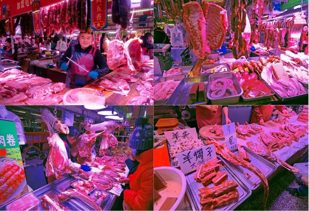 海鲜水产大厅西面连着肉食面食点厅,也可以从院外直接进入肉食面食点厅牛羊肉摊位种类齐全,猪肉摊位还可以代灌香肠