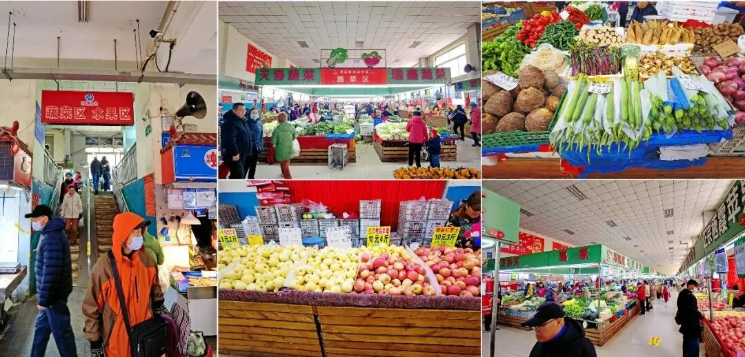 海鲜区的东面就是蔬菜水果厅了。这里相比较早市大院的摊位,环境更整洁、排布更规整,当季青菜以大白菜、菠菜、小油菜菜等为主,翠绿鲜嫩,各类瓜果则以苹果、梨、橙子、柑橘等耐储存的品种居多,从常见的白菜、土豆、芋头萝卜到冬季相对少见的卷心菜、西蓝花、芦笋、苦瓜、各类菌菇等果蔬这边是应有尽有,弥补了室外摊位的品类缺口。