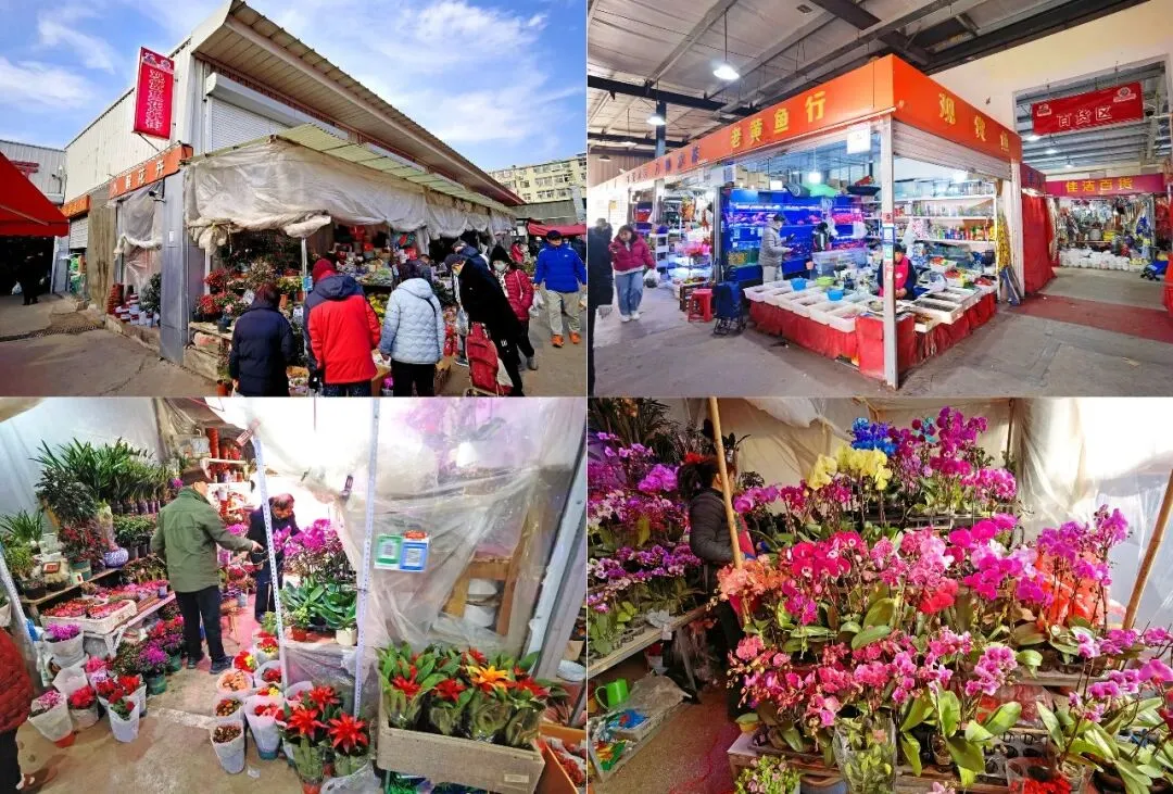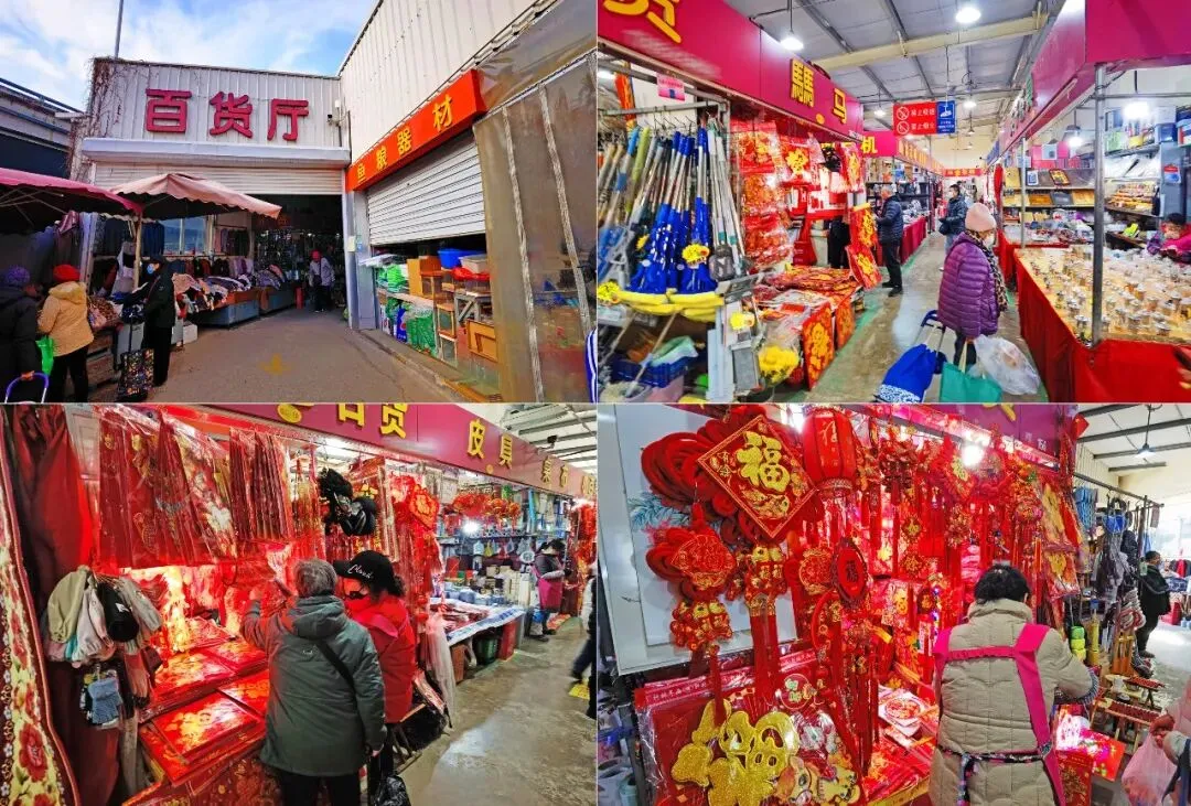 花卉厅的摊位摆放着绿萝、吊兰、发财树等绿植,还有各种应季鲜花,为早市增添了一抹春色,进入腊月很多居民都愿意挑选几盆好看花卉摆在客厅给冬季增加一些生机。 花卉区还有水族店各类观赏鱼、水草及用具也是一应俱全。继续往里走是百货厅,实用好物的聚集地,土特杂货、锅碗瓢盆、劳保棉袜手套等一应俱全;这里还有春节家家户户必备的喜字、对联和灯笼等杂货,很多顾客在此挑选回去,为家里增添一份节日喜庆。
