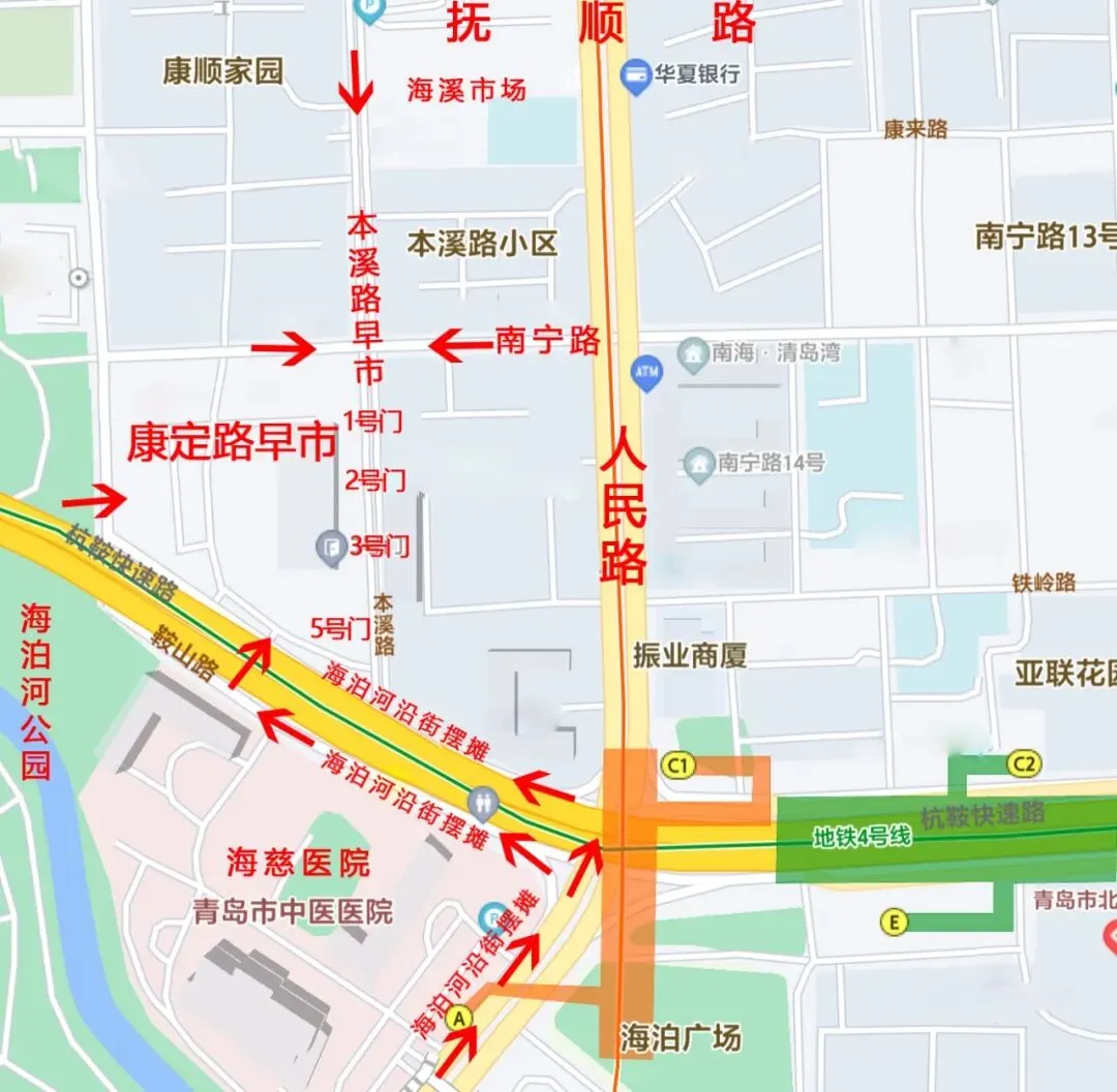 海泊河早市除了康定路农贸市场外,还有本溪路的海溪市场及本溪路与南宁路的路边摊位、鞍山路西 桥底两侧及人民路南侧路边摊位等。早市内外周边人流量极大。建议九、十点后前往,如时间充裕可沿图上红色箭头所示逛一下。