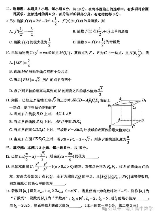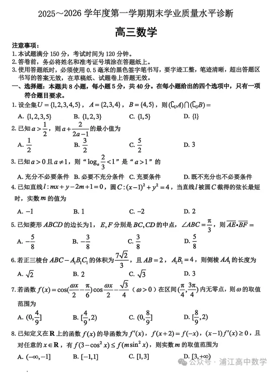 高三数学 |山东省烟台市2025-2026学年高三上学期期末学业质量水平诊断数学试题2026.1