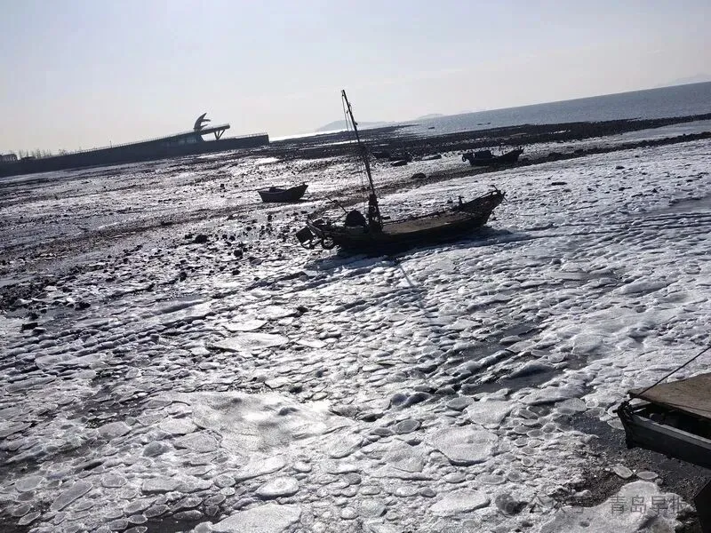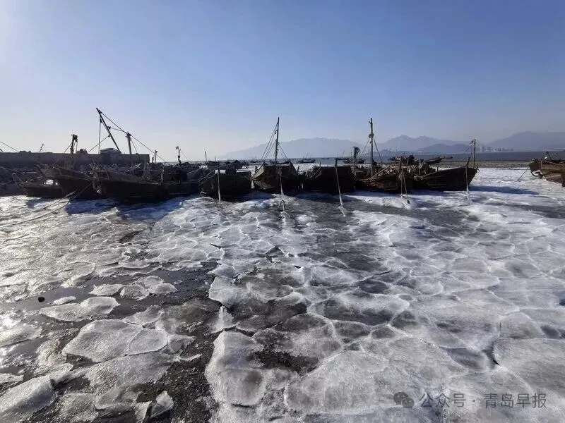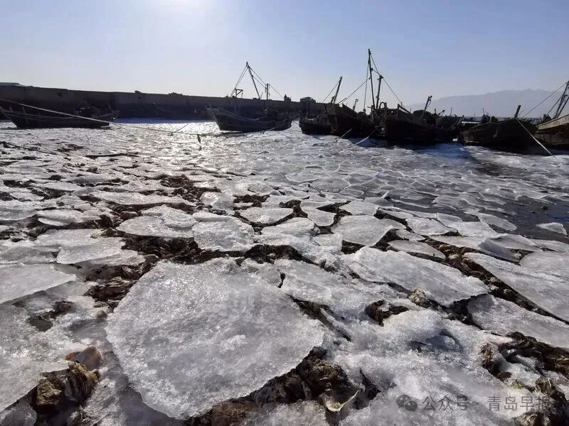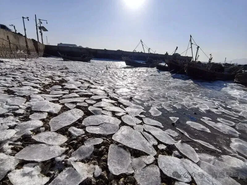 青报君赶到盘龙庄码头,往日汹涌的海面被厚厚浮冰严严实实覆盖,恰似一片广袤无垠的白色雪原。近岸礁石被透明冰层紧紧包裹,冰凌在阳光照耀下闪烁着五彩光芒,美不胜收。凌晨气温大幅下降,海水退潮后迅速冻结,多处渔港码头浅滩被大面积海冰占据,部分区域冰层厚达 10-15 厘米,几十艘小型渔船被浮冰牢牢固定,宛如镶嵌在“冰床”之中。