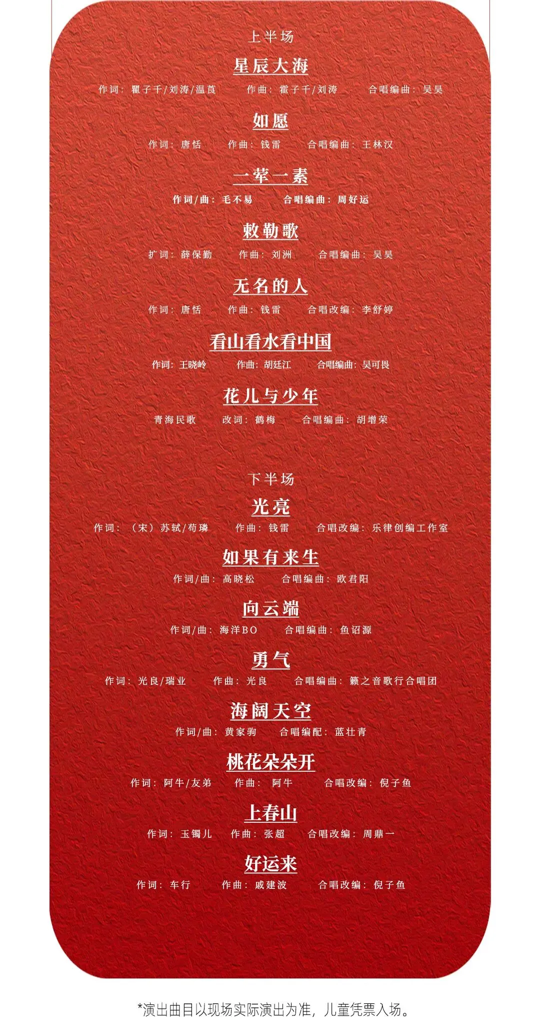 丰富多样的曲目:精心选曲和编排,涵盖多种风格和类型的音乐作品,满足不同观众的欣赏需求,展现合唱艺术的广泛性和多样性。