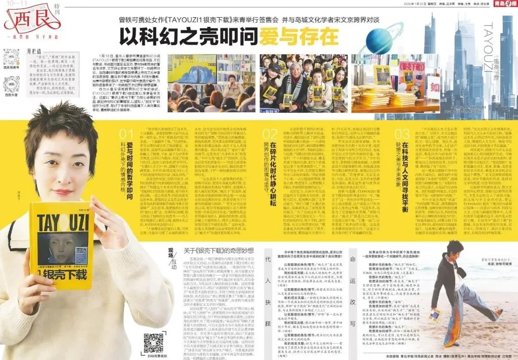 1月18日,音乐人曾轶可携首部科幻小说《TAYOUZI1银壳下载》亮相青岛如是书店,不仅与歌迷、书迷面对面签名互动,更与特邀而来的著名书法家、文艺评论家宋文京展开了一场跨界对谈。当旋律创作者的感性哲思遇上传统文化学者的深邃洞察,围绕书中意识与肉身、科技与情感、完美与缺憾的探讨,在字里行间与言语交锋中,为现场读者带来了一场跨越艺术边界的思想盛宴。