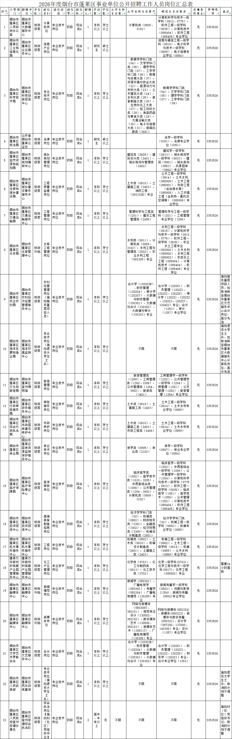咨询电话:0535-6905229,招聘单位及主管部门咨询电话见附件1