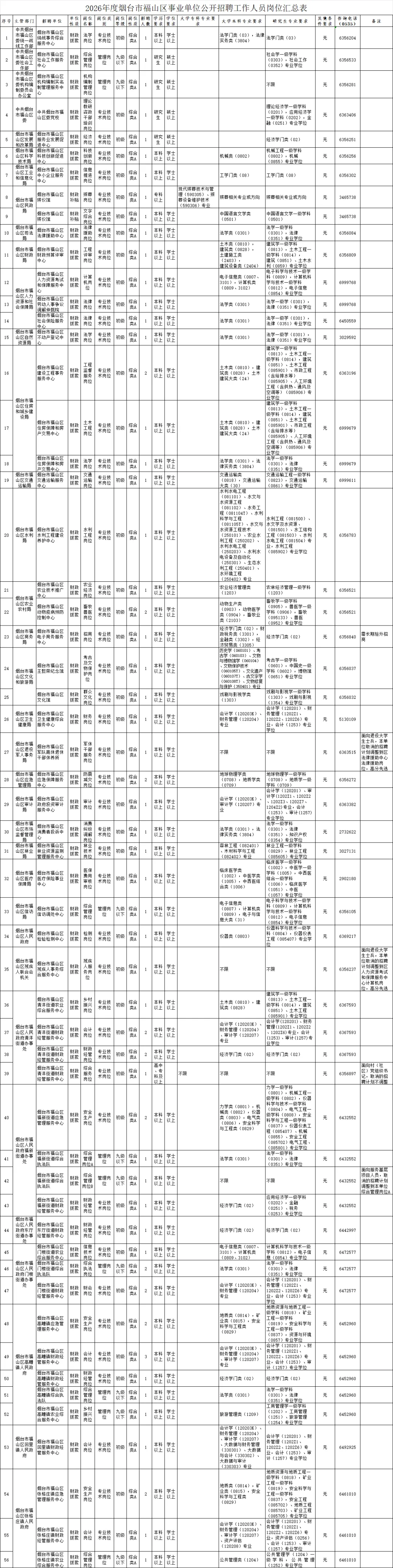 市属事业单位公开招聘工作人员的岗位条件、招聘人数等具体要求见《2026年度烟台市市属事业单位公开招聘工作人员岗位汇总表》(附件1)。