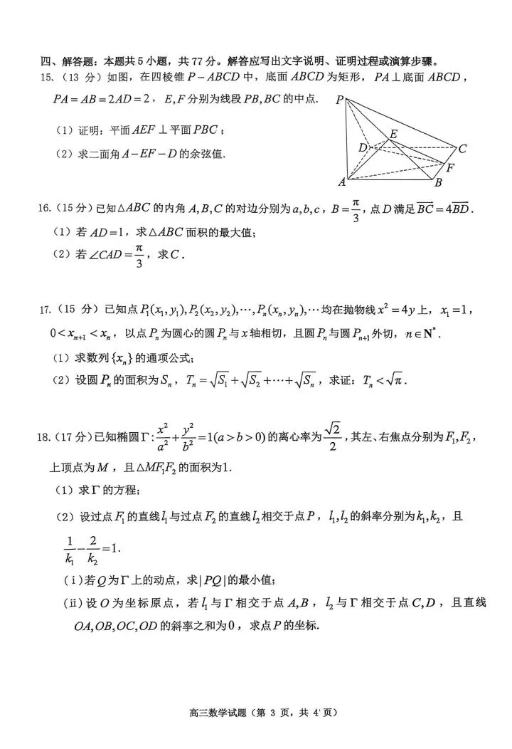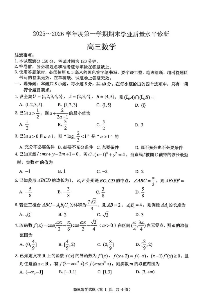 烟台市26届高三上学期1月份期末考试试题(数学)
