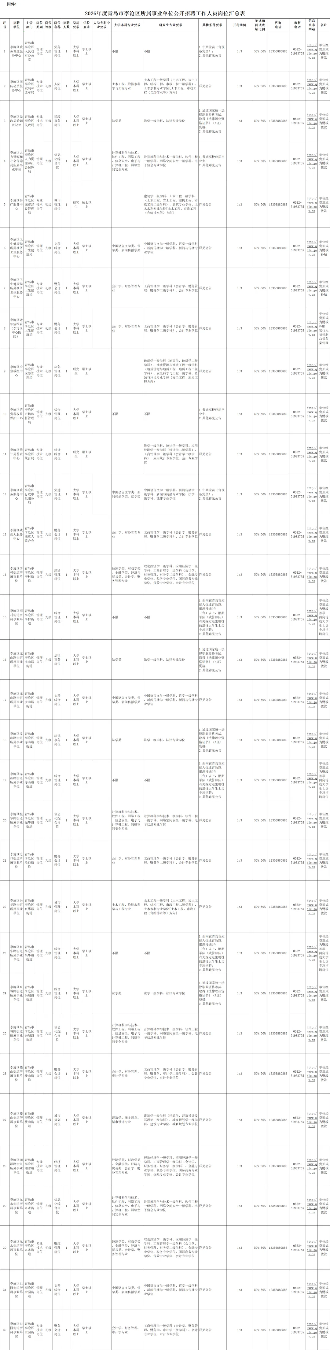 根据事业单位公开招聘有关规定,结合事业单位岗位空缺情况和工作需要,2026年度青岛市李沧区所属事业单位面向社会公开招聘工作人员32名(详见附件1《2026年度青岛市李沧区所属事业单位公开招聘工作人员岗位汇总表》,以下简称《岗位汇总表》),现将有关事项公告如下: