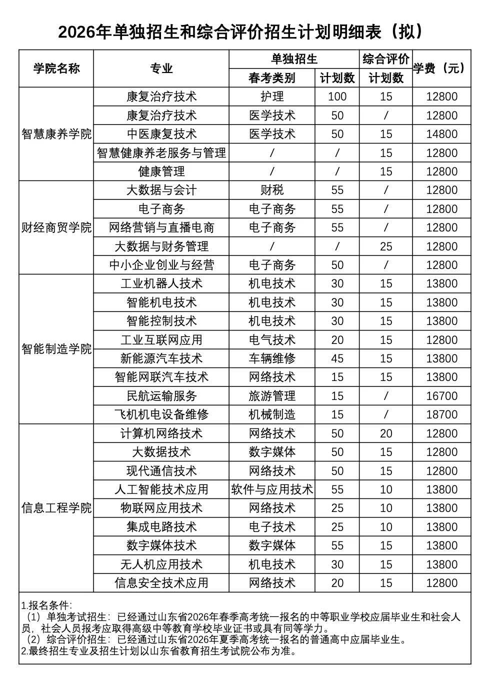 >烟台城市科技职业学院2026年单独招生和综合评价招生计划(拟)