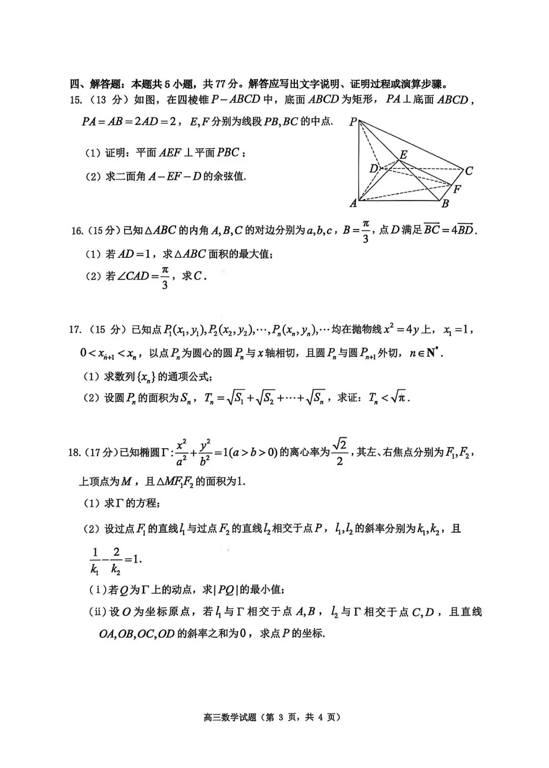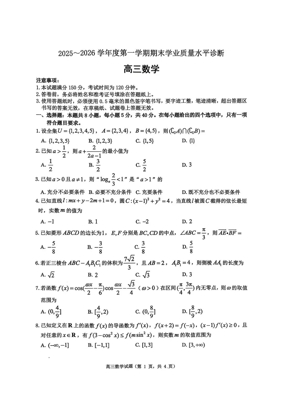 >山东省烟台市2025-2026学年高三上学期期末学业质量水平诊断数学试题+答案