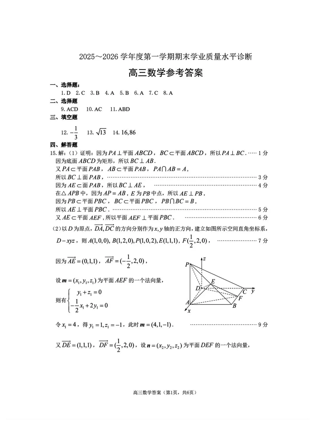 山东省烟台市2025-2026学年高三上学期期末学业质量水平诊断数学试题+答案