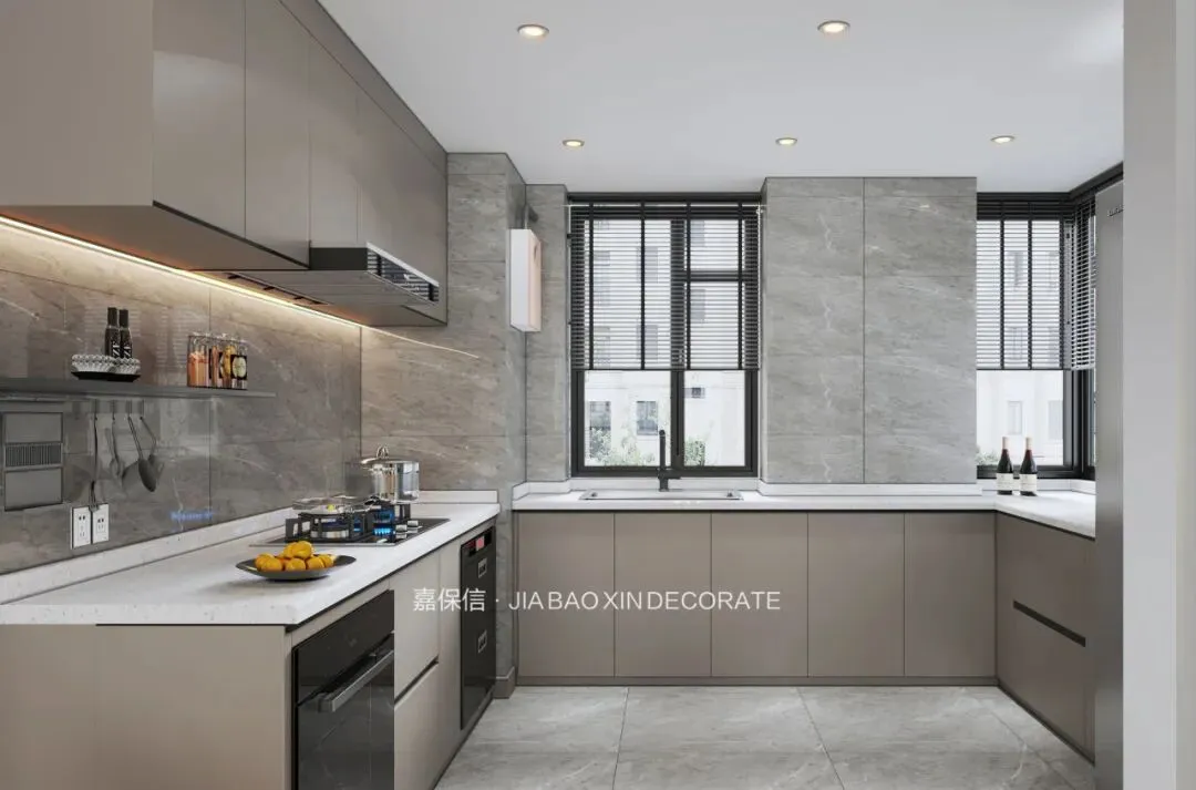 厨房,是明朗通透的开放空间。灰色大理石墙砖与白色大理石台面,形成色彩与材质的对话。U型橱柜围合出利落动线,做饭时格外顺手。筒灯如星辰洒落,吊柜下的灯带温柔漫射,将操作台笼上一层光晕。水槽临近窗户,洗菜时阳光便溜进来,连水珠都闪着光。