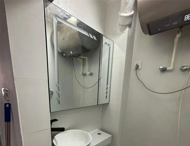 你可能不敢相信,这1平米的卫生间居然还留出了洗澡的空间!热水器装在斜管的冗余位置,一点空间都不浪费,虽然没法做干湿分离,但利用蹲便快速排水的特点,洗完澡地面很快就能干爽,真的是把每一寸空间都用到了极致。