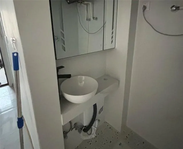 更离谱的是,洗手池下面的排水管直接耷拉到马桶上,这个设计真的是太潦草了,不仅不卫生,用起来也特别别扭。收纳空间就更不用说了,只有洗手池旁边一个转角架,完全不够用啊!