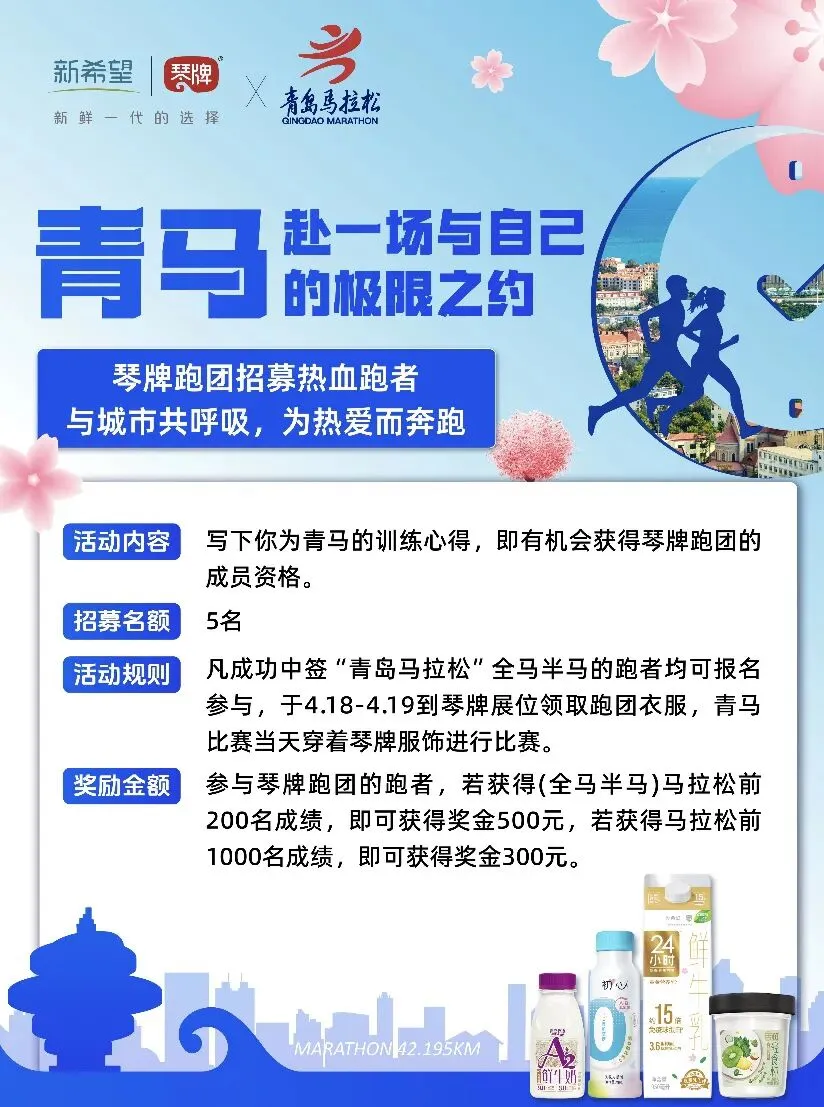青岛马拉松 | 琴牌跑团招募热血跑者!中签全/半马速来!4.18-19日琴牌展位👉免费领赛道战袍🔥🏃♂️跑出名次立拿现金:全马/半马TOP200→💰500现金秒到账全马/半马TOP1000→💰300现金狂飙领穿上琴牌战衣开跑,完赛亮衣服就能兑奖!24小时极限冲刺,就等你开挂!💥