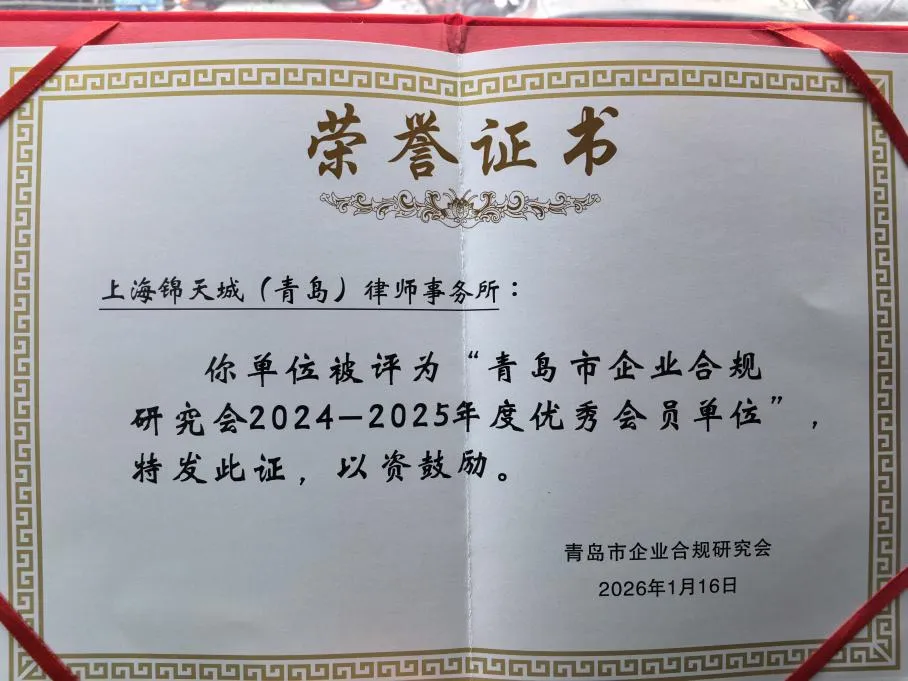 在未来,锦天城(青岛)律所将以此次获评优秀会员单位为契机,继续依托青岛市企业合规研究会的平台优势,充分发挥专业所长,持续优化合规服务产品,为企业提供更具针对性、可操作性的合规解决方案,助力青岛打造市场化、法治化、国际化营商环境,为企业高质量发展保驾护航。