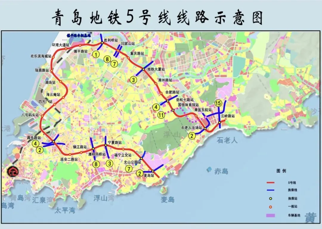 地铁5号线是串联青岛中心区轨道交通网络的“C”形线路,全长32.6公里,设站27座,连接市南区、市北区、崂山区,与多条线路实现换乘。