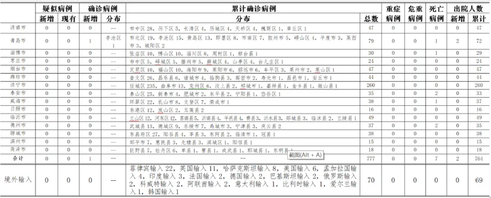 山东新增本地确诊病例1例。累计报告确诊病例777例,死亡7例。新增治愈出院病例2例,累计治愈出院764例。
