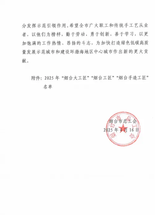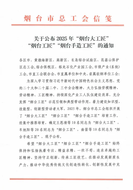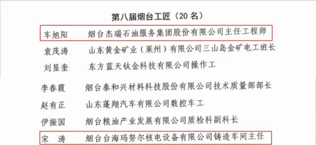 近日,烟台市总工会公布2025年烟台工匠名单,莱山经济开发区职工烟台杰瑞石油服务集团股份有限公司主任工程师车旭阳、烟台台海玛努尔核电设备有限公司铸造车间主任宋涛获评“烟台工匠”。