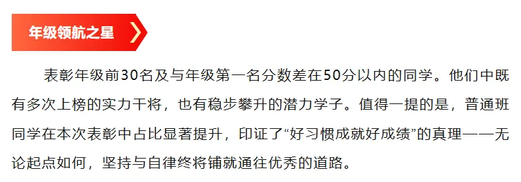 据介绍,普通班同学在本次表彰中占比显著提升,印证了“好习惯成就好成绩”的真理——无论起点如何,坚持与自律终将铺就通往优秀的道路。