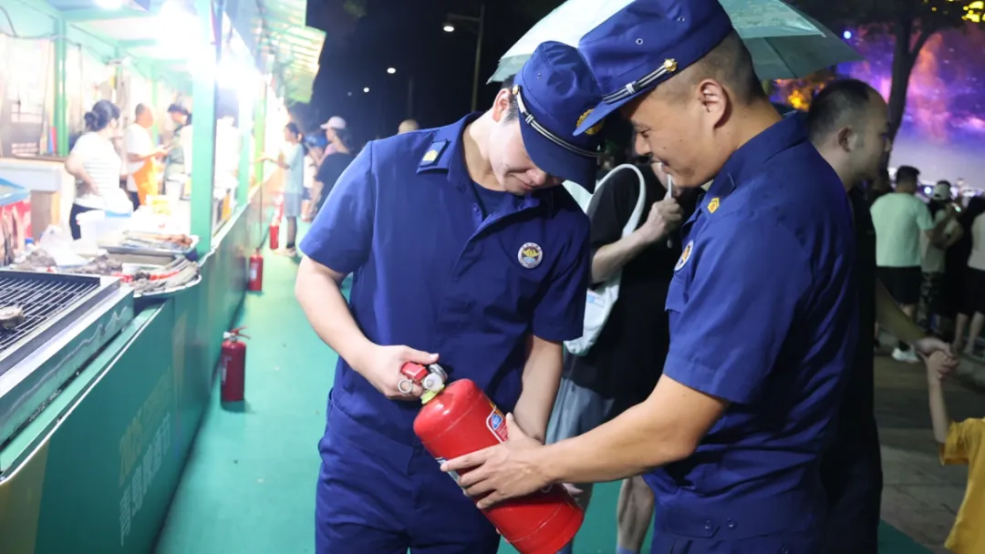 在人潮与摊位之间,濂溪区消防救援大队的消防员们同样忙碌不停。他们穿梭在热闹的人群中,目光如炬地排查着每一个可能存在的安全隐患,为这浓浓的人间“烟火气”装上了可靠的“安全阀”。 他们仔细检查着每个角落的灭火器,确保数量充足且摆放位置醒目易取,能在紧急情况下迅速发挥作用。正是这份细致与严谨,让游客们能在欢乐中安心享受,无需为安全问题担忧。